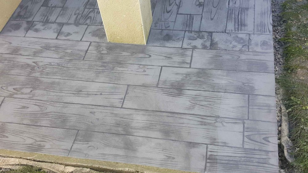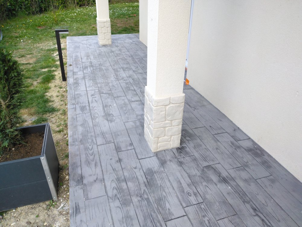 Création d'une terrasse en béton imprimé moule parquet dans une maison à Troyes